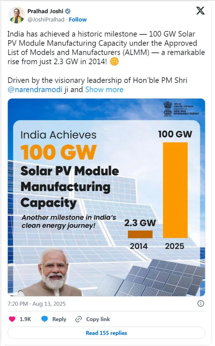Prahad Joshi, minister Indicae Novae Renovatae Energy Foederis, hoc factum extulit, dicens: "India miliarium historicum consecutus est sub probatis exemplaribus et Fabrica (ALMM), moduli photovoltaici instrumenti solaris facultatem centum gigawatts pervenerunt, notabile incrementum ab 2.3 gigawatts anno MMXIV! Sub ductu visionarii Primi Ministri Narendra Modi et vis impulsus inceptorum transformativarum ut efficax Solaris Module productio Coniunctum Schema incitamentum (PLI), India fortem et se sufficiens fabricandi oecosystematis solaris aedificat. Hoc factum gressum versus Atmanirbhar Bharat augebit et India adiuvet ut suum scopum attingat 500 gigawatts energiae non fossilis ab 2030 capacitate productionis.