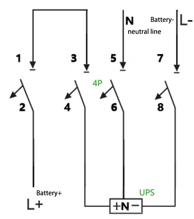 E:Exempli gratia: Pro UPS cum capacitate 40 kVA, chordarum 40 cellularum aestimatae altilium, et nexus filum neutrum (coactionem intentionis coaequans: 14 V × 40 = 560 V, i.e. ±280 V), maxima vena operativa computatur ut 40 kVA × 1.0 ÷ 90% ÷ 10 V 40 = 111 A. A 4P 750 V 150 Circuitus ruptor e perticis in seriebus suis coniungi potest. Modus wiring talis est: